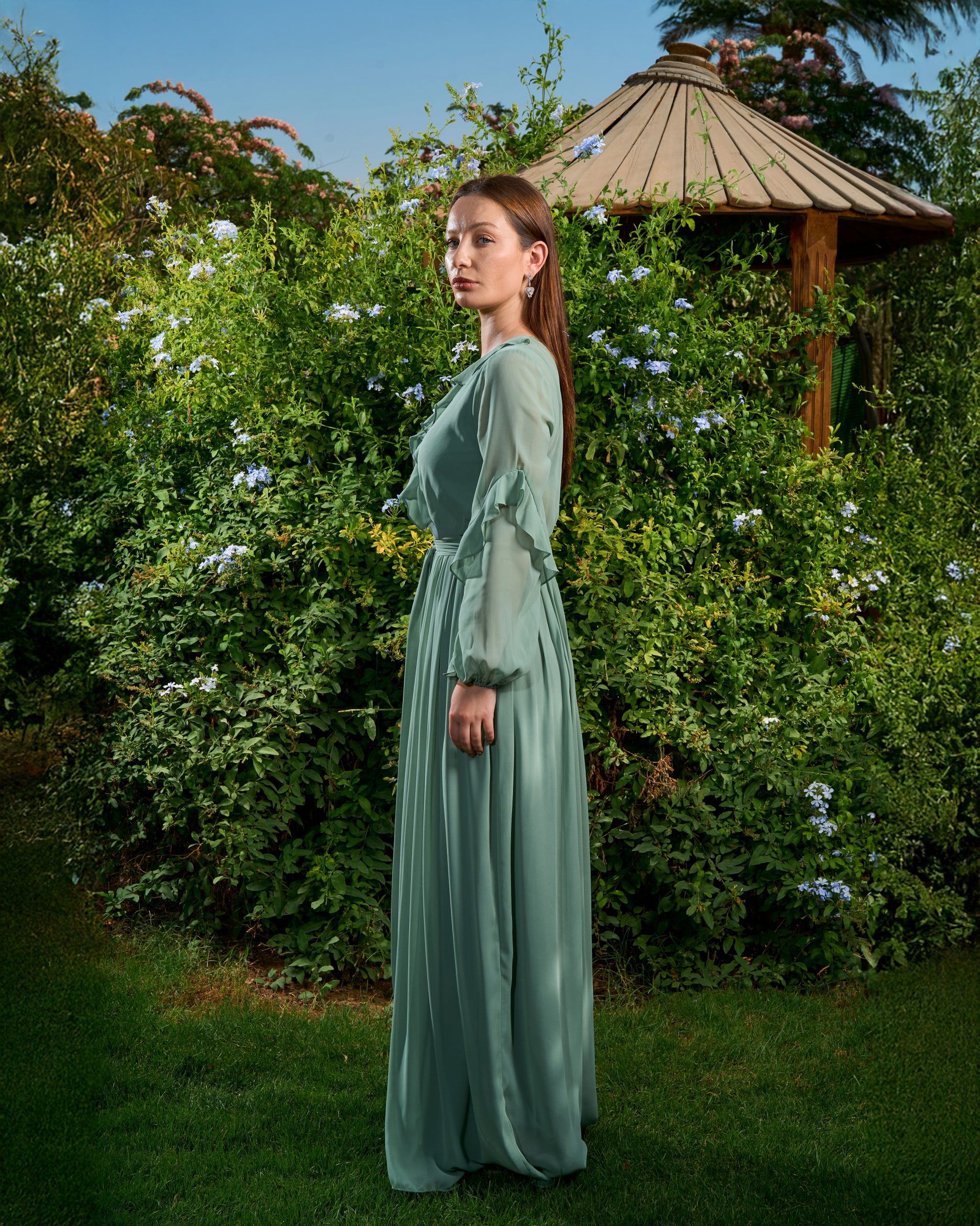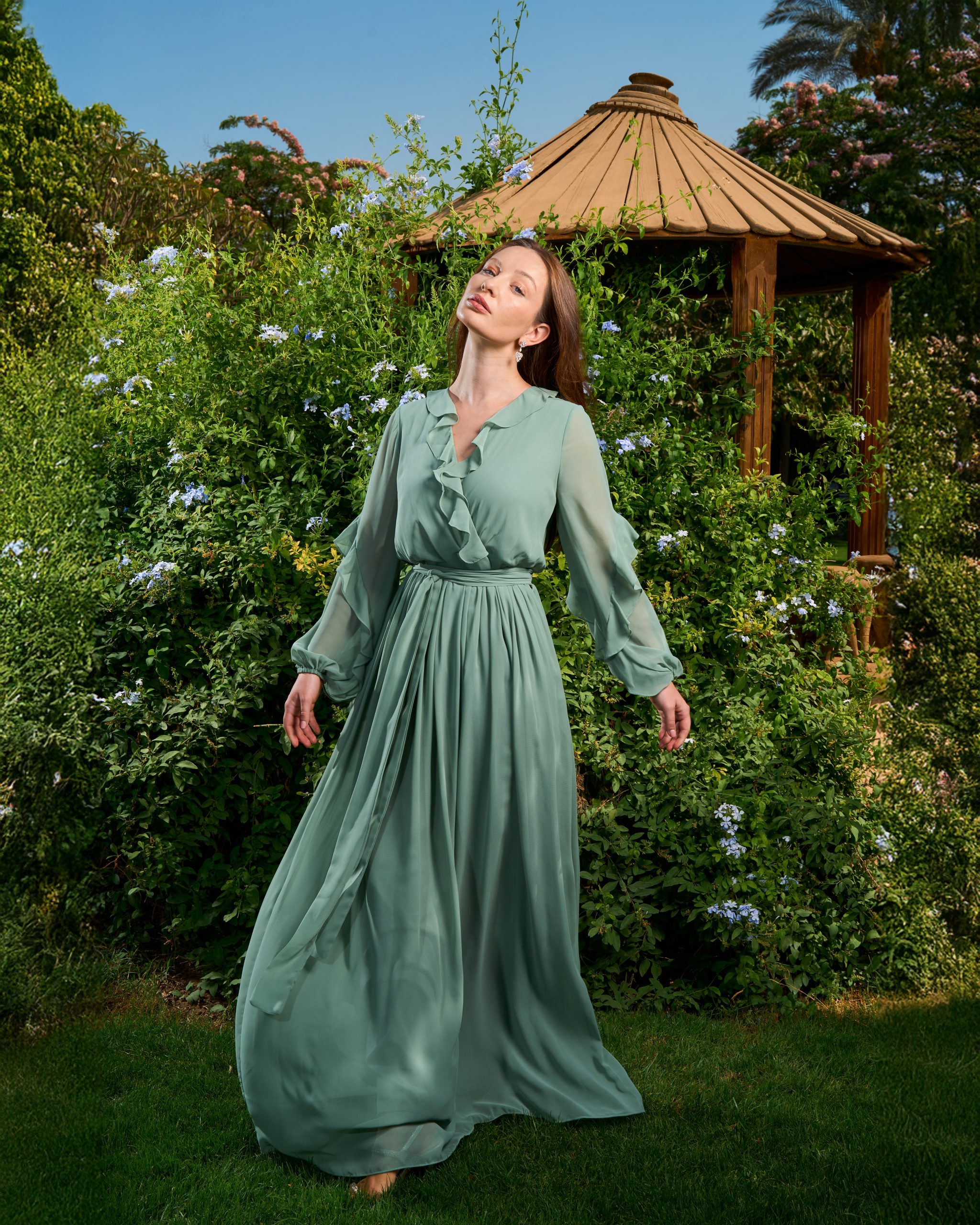 - Product Details: Chiffon Maxi Dress, V neck, Self-lined, Elastic waist with ruffle details